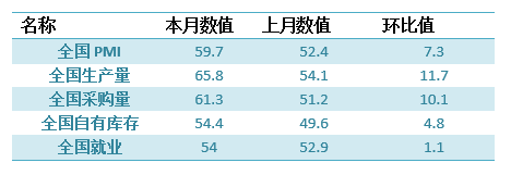 具体观察各项指标,PMI指标为59.7%,比上月回升7.3个百分点。生产量指标为65.8%,比上月回升11.7个百分点。产品订货指标比上月回升12.9个百分点。自有库存指标为54.4%,比上月回升4.8个百分点。就业指标为54%,比上月回升1.1个百分点。