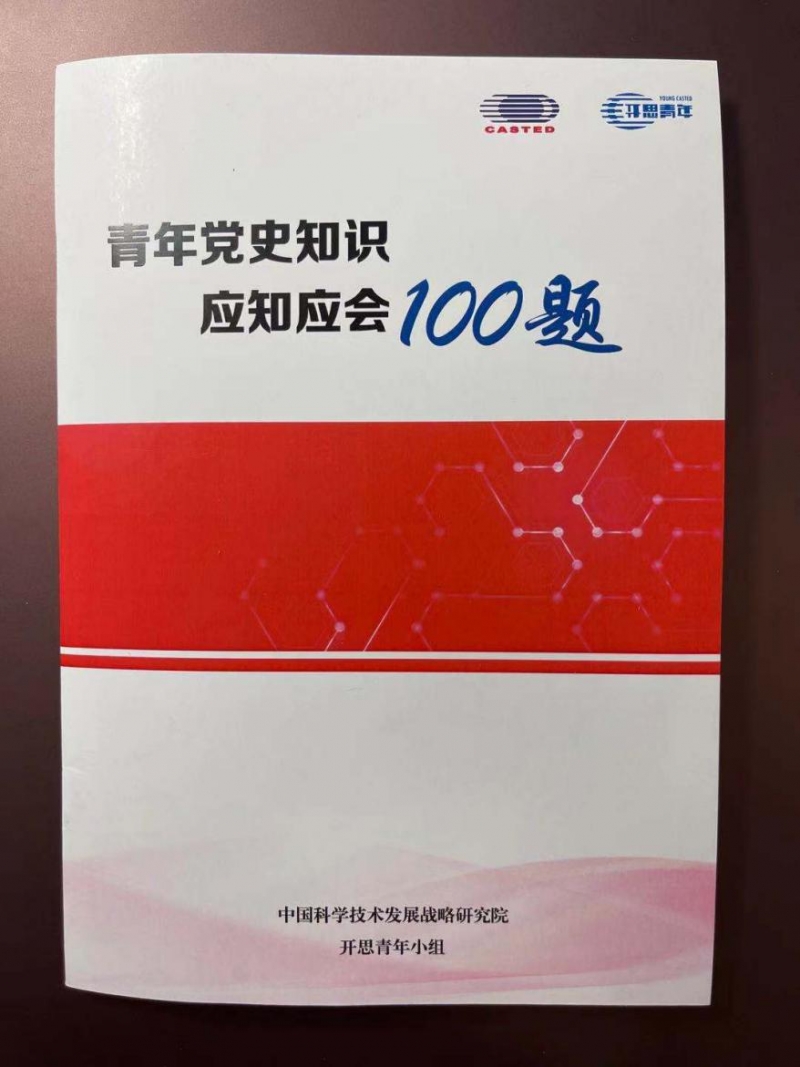 为进一步推动战略院青年党员干部学党史、悟思想、办实事、开新局,落实好科技部机关党委关于开展“党在我心中”青年党史知识大赛的相关工作,2021年4月12日战略院党办与开思青年小组组织编写并印发《青年党史知识应知应会100题》,鼓励青年干部深入开展党史学习教育活动,推动青年传承红色基因,牢记初心使命。