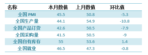 具体观察各项指标,PMI指标为45.5%,比上月回落5.3个百分点。生产量指标为44.1%,比上月回落10.8个百分点。产品订货指标为42.6%,比上月回落7.9个百分点。进口指标为51.4%,比上月回升8.2个百分点。自有库存指标为55%,比上月回升1.4个百分点。就业指标为46.5%,比上月回落0.8个百分点。
