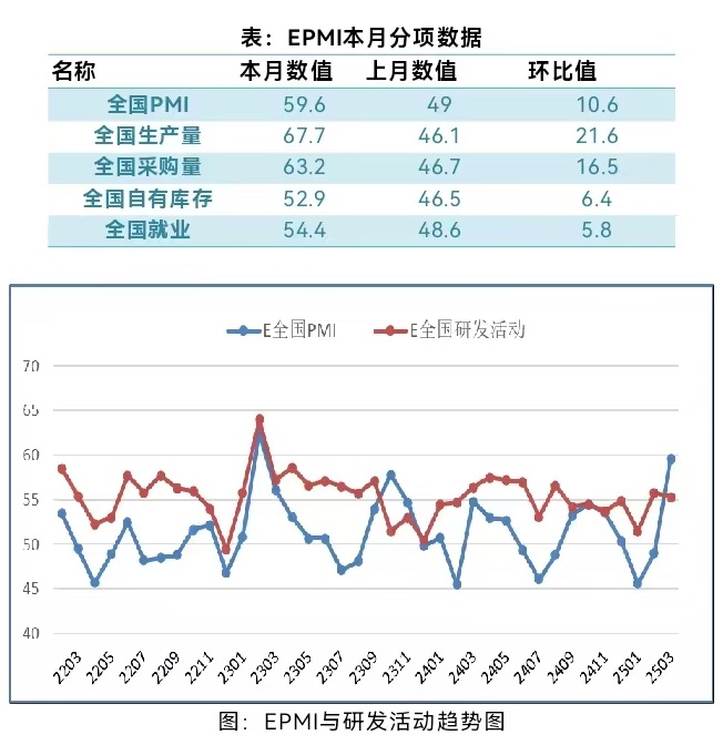 具体观察各项指标,PMI指标为59.6%,比上月回升10.6个百分点。生产量指标为67.7%,比上月回升21.6个百分点。自有库存指标为52.9%,比上月回升6.4个百分点。就业指标为54.4%,比上月回升5.8个百分点。