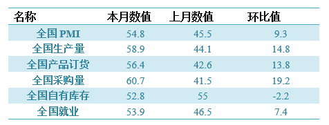 具体观察各项指标,PMI指标为54.8%,比上月回升9.3个百分点。生产量指标为58.9%,比上月回升14.8个百分点。产品订货指标为56.4%,比上月回升13.8个百分点。进口指标为53.3%,比上月回升1.9个百分点。自有库存指标为52.8%,比上月回落2.2个百分点。就业指标为53.9%,比上月回升7.4个百分点。